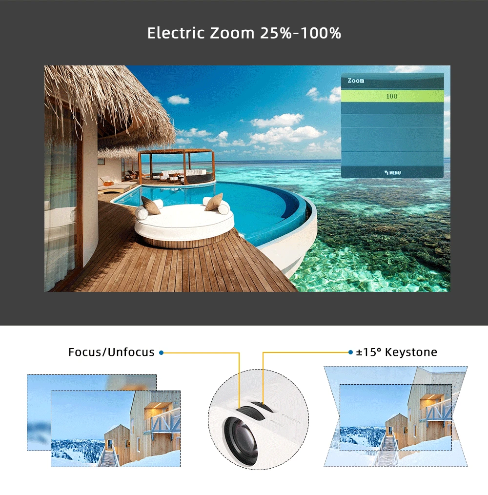 Electric Zoom25%-100%( Other projector only can work 75% — 100%)