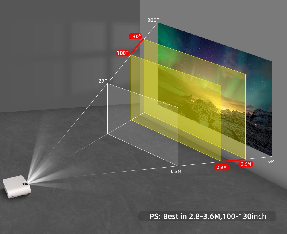 The video projector offers the projection size from 27inch to 200inch depending on the distance and 100-130inch is the recommended viewing distance.